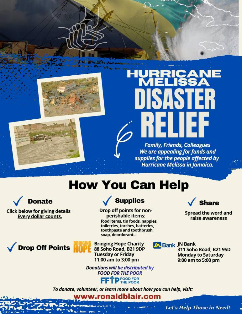 Seeking support from family, friends and colleagues to give funds and supplies for the people affected by Hurricane Melissa in Jamaica. ...