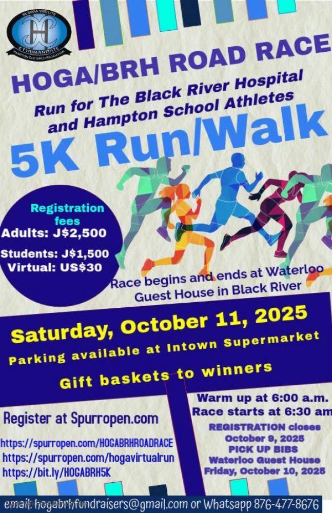 In our continued efforts to support the Black River Hospital (BRH) The Hampton Old Girls Association (HOGA) will on 11 October 2025 host a 5k run/walk in Black River, St Elizabeth. Funds raised will go towards the ward at the hospital already started by the Friends of the BRH and the Hampton School Sports programme.