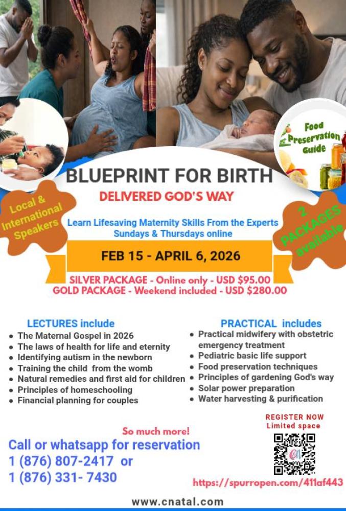 Blueprint for Birth is a transformative training course designed to guide families through the sacred journey of conception, pregnancy, birth, and early parenting according to God's original design. Participants will explore how to: - Prepare the body and mind before conception - Cultivate a spiritual atmosphere during pregnancy and labor - Experience bonding, blessing, and breastfeeding in harmony with God’s plan - Practice parenting as discipleship—raising children for the kingdom of God Each session is rich with Scripture, prayer, natural health principles, and practical tools to restore the home as heaven’s first classroom. Whether you're expecting your first child or mentoring other parents, Blueprint for Birth will help you discover the Creator’s purpose in one of life’s most sacred assignments. Impacting the entire family, sons, husbands, aunties and uncles! REVIEW OUR PAYMENT OPTIONS: https://forms.gle/GJrgJBTwRd3iQsxz9 Join us from maternity to eternity….. Where a lifetime of health begins!