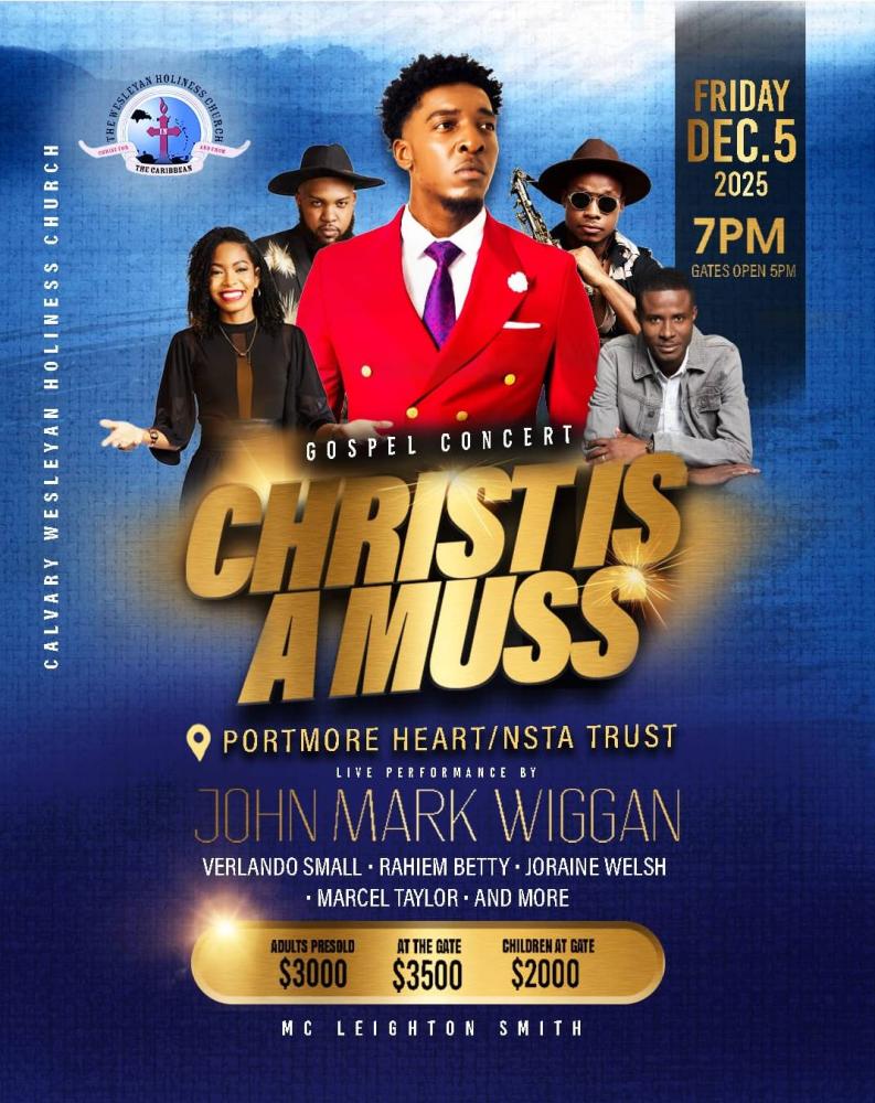 Calvary Wesleyan Holiness Church presents Christ Is A Muss! Join us at 7 PM on Friday, December 5, 2025, at the Portmore Heart/NSTA Trust auditorium. See live performances by Johnmark Wiggan, Raheim Betty, Joraine Welsh, Verlando Small, Marcel Taylor, and more.