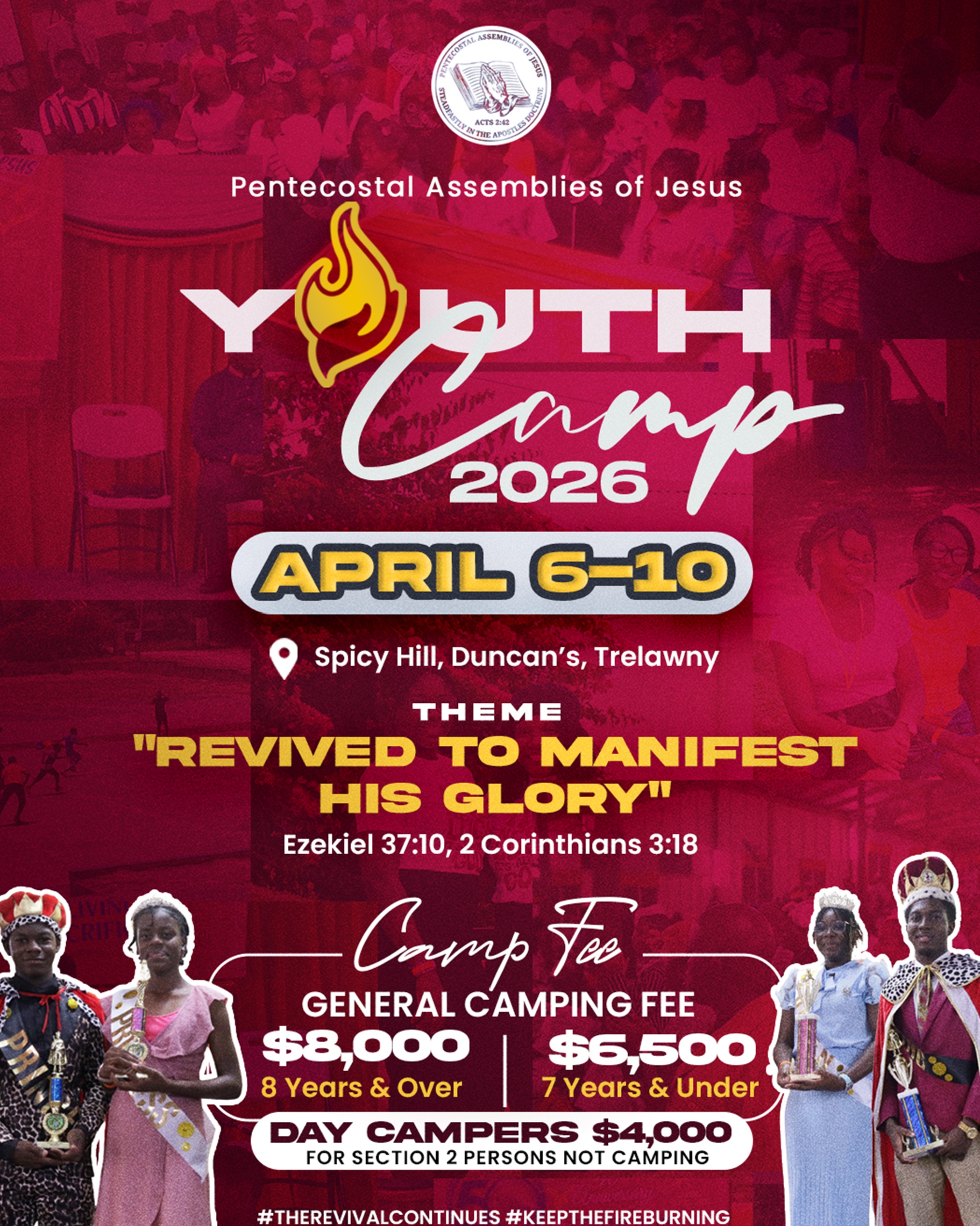 Share this pageYouth Camp 2026 is a five-day gathering focused on worship, fellowship, and spiritual renewal under the theme: “Revived to Manifest His Glory”. April 6–10, 2026 at Spicy Hill, Duncan’s, Trelawny